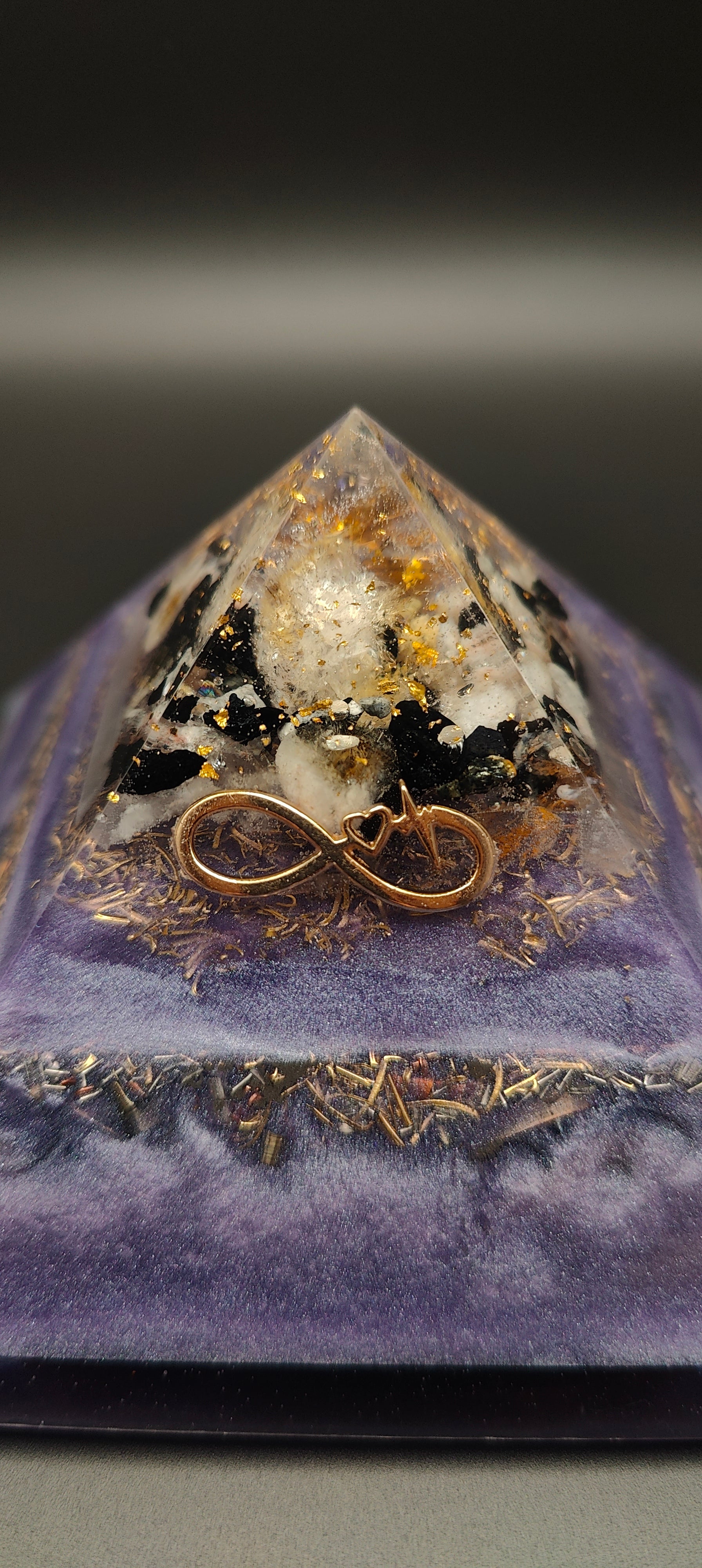 In der Spitze sitzt ein Citrin-Rohstein in Harz mit 24K Blattgold angereichert. Umrahmt wird sie von weiterem Citrin, Bergkristallspitzen, schwarzem Turmalin und Selenit. Ein Unendlichkeitszeichen als kraftvolles Symbol für stetigen Energiefluss und Harmonie ziert zwei Seiten.
