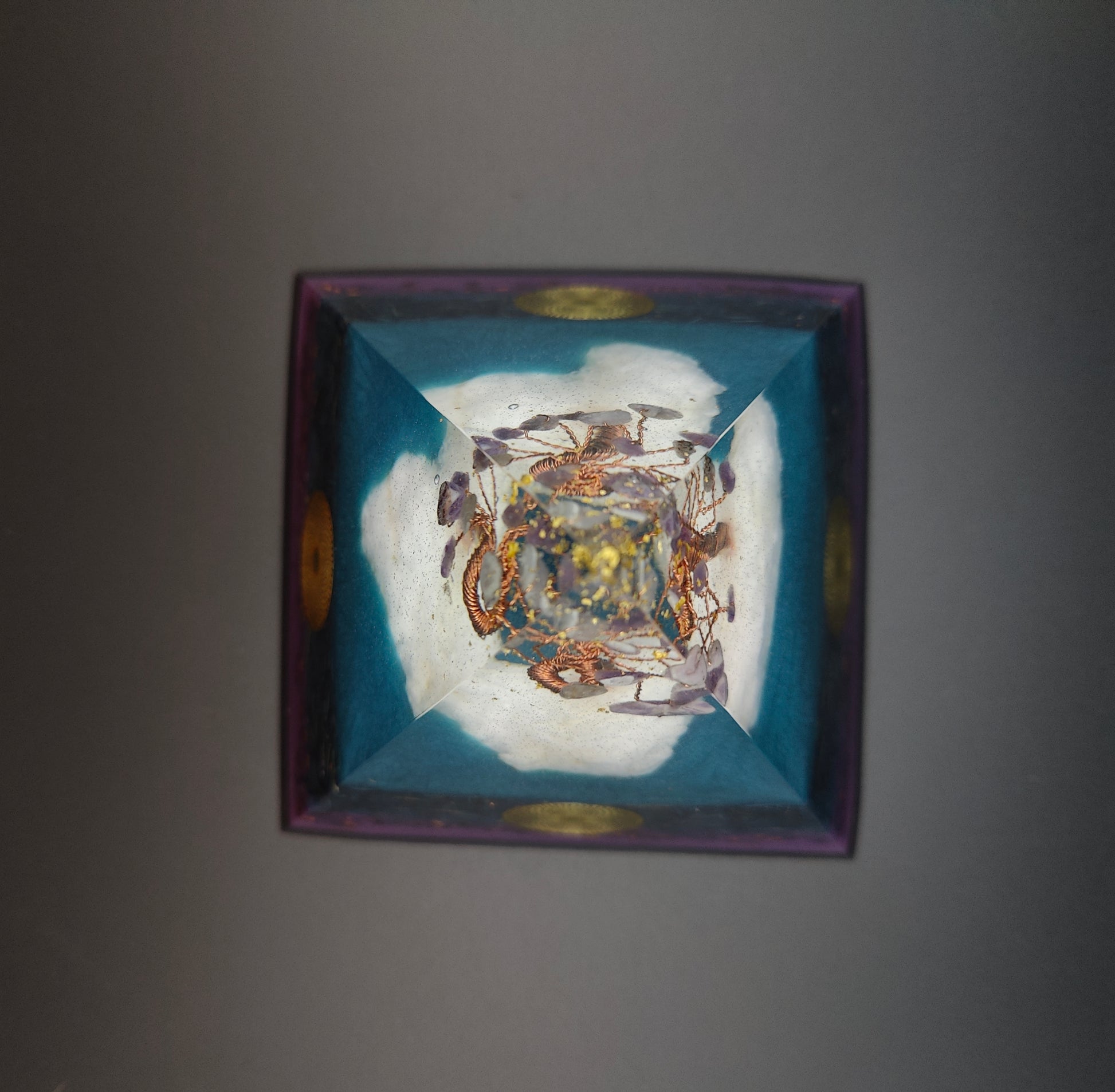 Diese besondere Pyramide beherbergt unter einem Dach mit 24 Karat Blattgold im klaren Harz, einen Baum aus Kupfer mit Amethyst-Steinchen auf einem majestätischen Bergkristall, der wie ein kleiner Eisberg inmitten der meergrünen Schicht ruht.