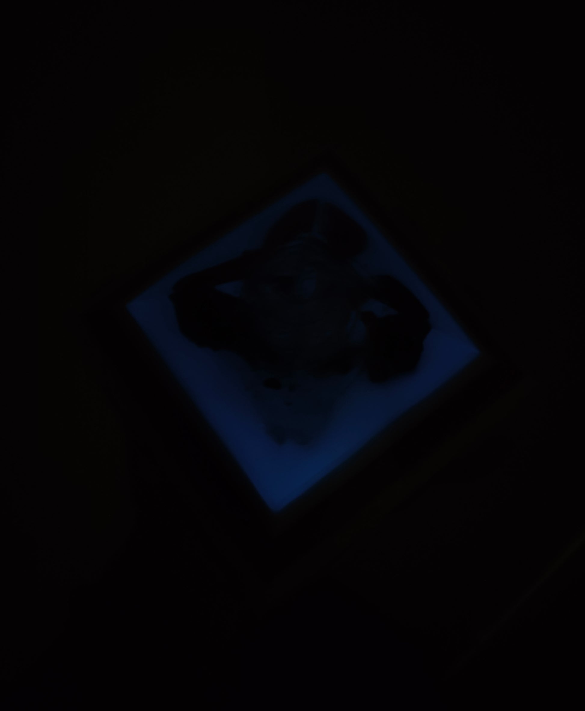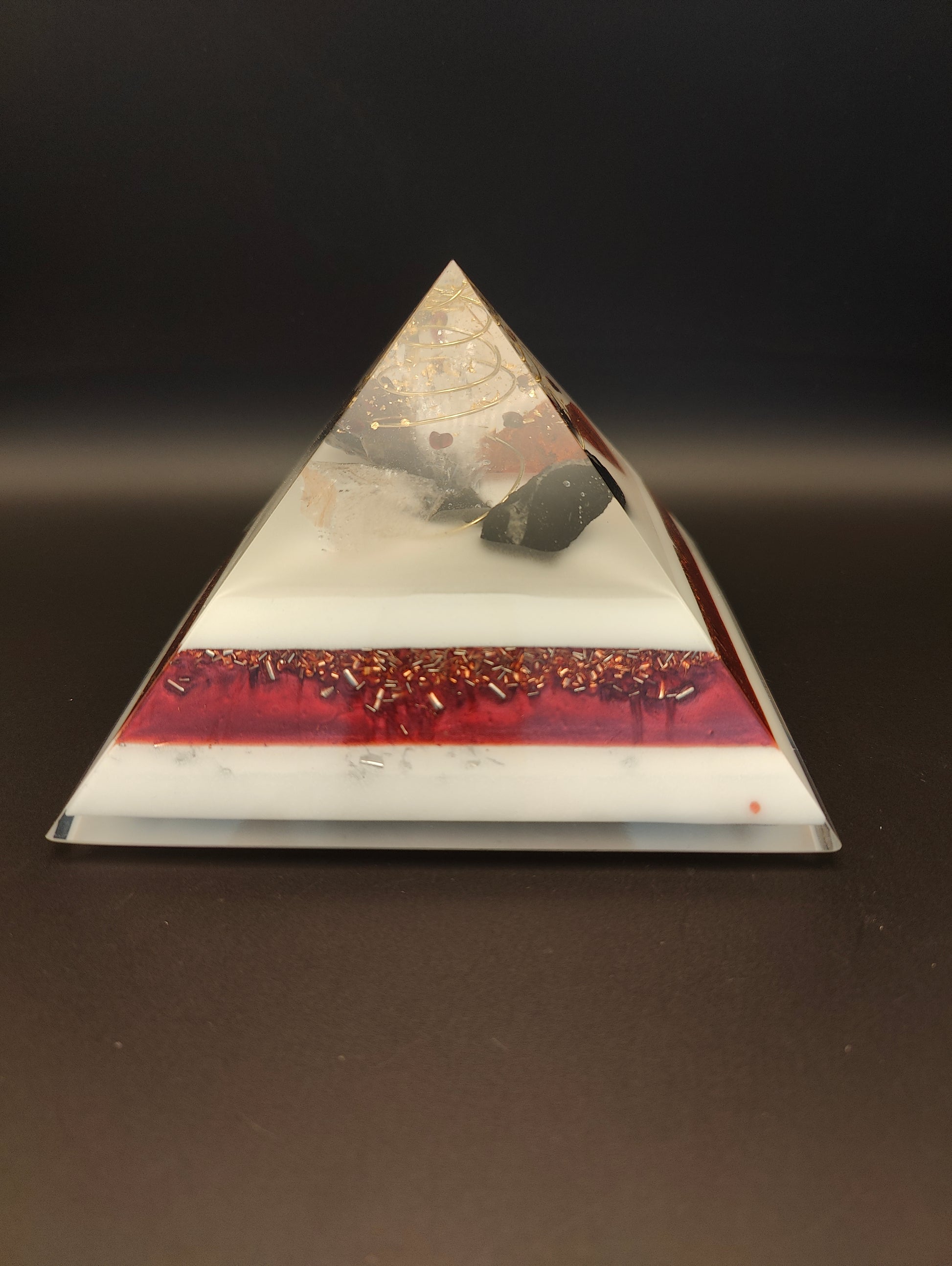 Über der ersten weißen Schicht liegt eine dünne Leuchtschicht. Die weißen Schichten enthalten zusätzlich zu Eisen auch Eisenoxid und Bergkristallpulver, die wunderschöne rote Farbe enthält Granatsand, Eisen, Messing, Kupfer und Agnihotraasche, wie immer alles in hochwertigem Epoxitharz.