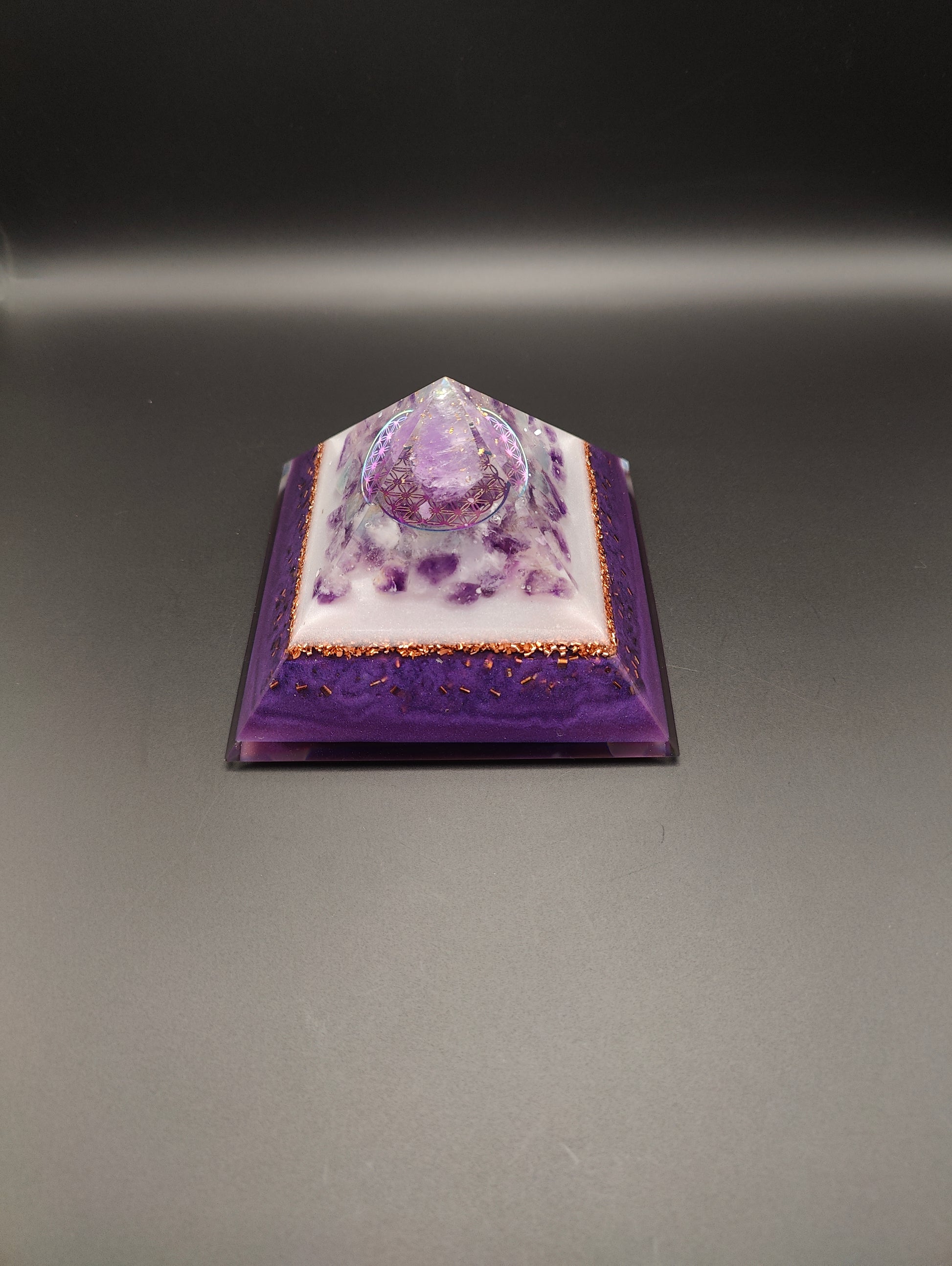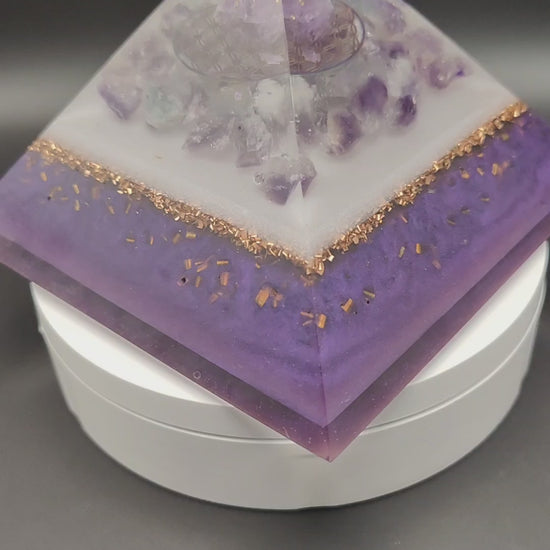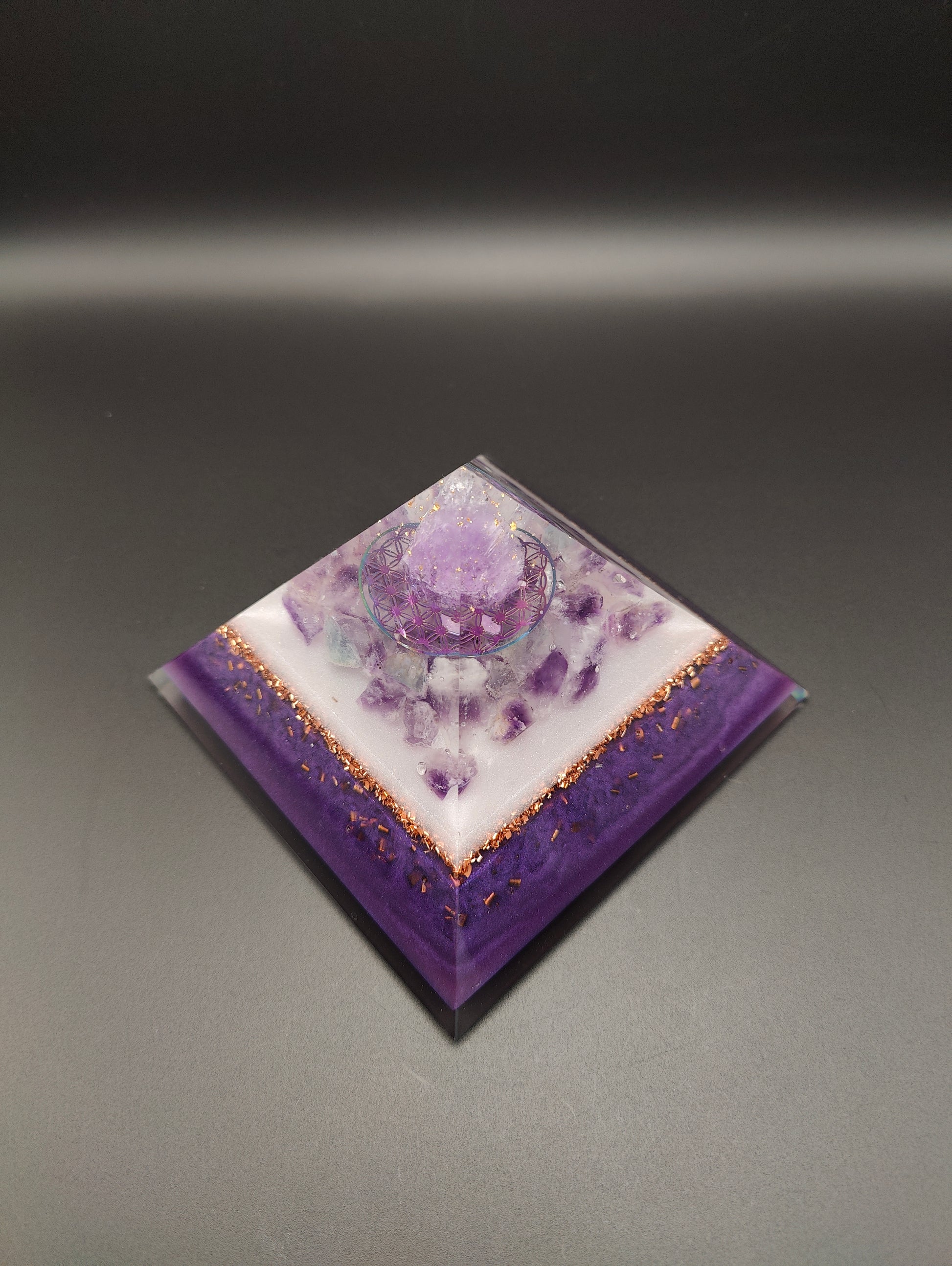 In einer 24K-Blattgold-Schicht sitzt ein Amethyst Kegel auf einer schimmernden Blume des Lebens. Darunter liegen viele Amethyst- und Fluorid Steine, zudem 4 Bergkristallspitzen. Die schmale weiße Schicht schimmert wunderschön, die schmale Kupferschicht passt perfekt ins Bild. In der Farbschicht versteckt finden sich noch Shungit.