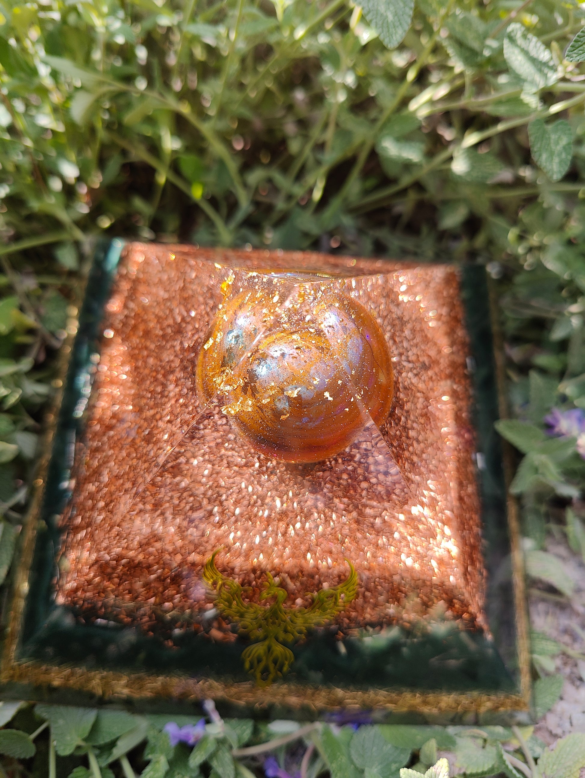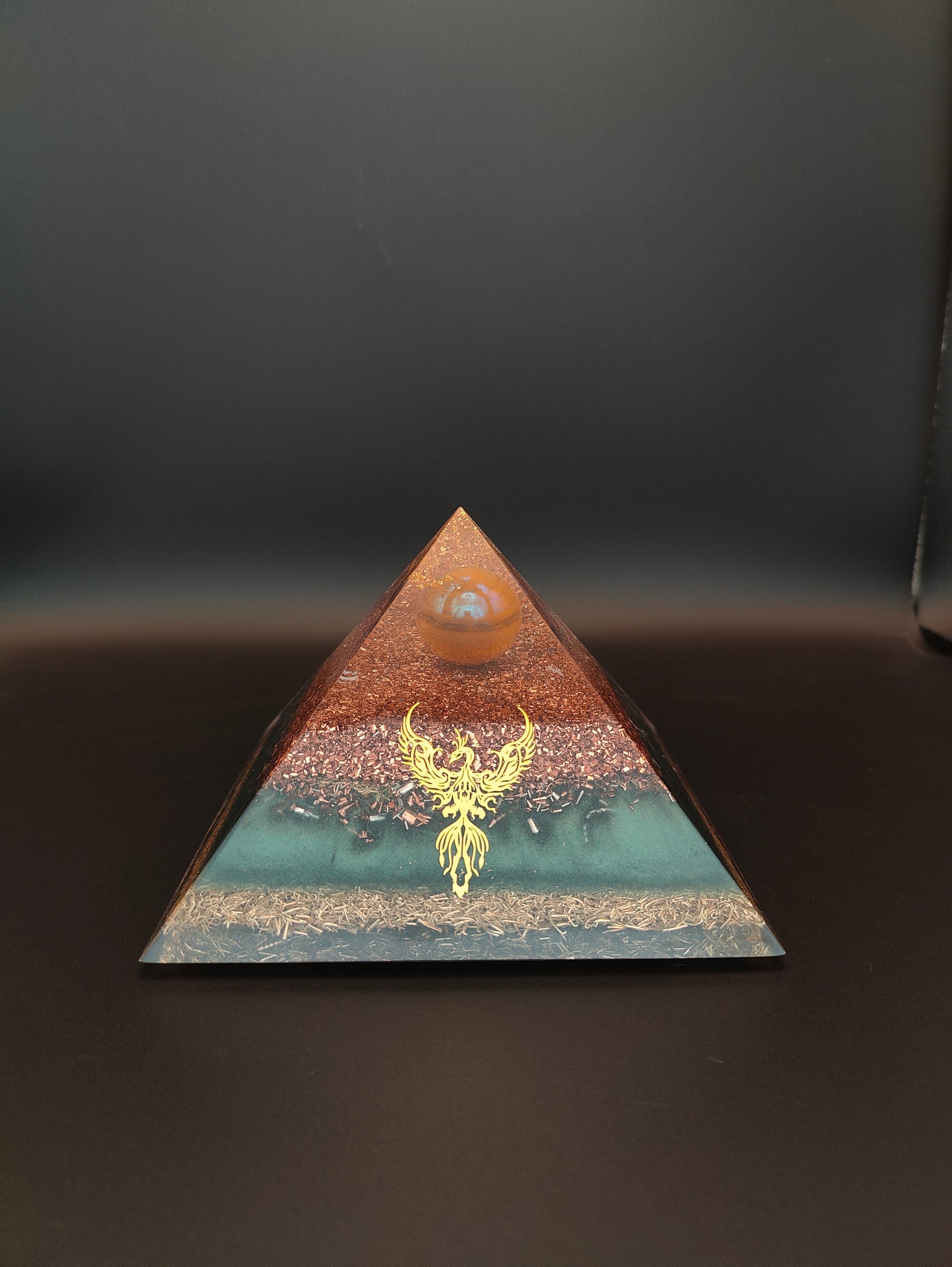 Unter einem Dach mit 24 Karat Blattgold im klaren Harz thront eine super schöne Aura Jaspis Kugel. Diese sitzt in einer mächtigen und kraftvollen Schicht aus reinem Kupfer. Die Power merkt man dieser Pyramide an! Die Farbschicht darunter enthält neben Eisen, Kupfer, Messing und Agnihotraasche auch Bergkristall, Selenit und Shungit. Eine Messingschicht beendet diese besondere Pyramide. (diese ist auf der Rückseite der Pyramide schmäler geworden als auf der vorderen Seite)