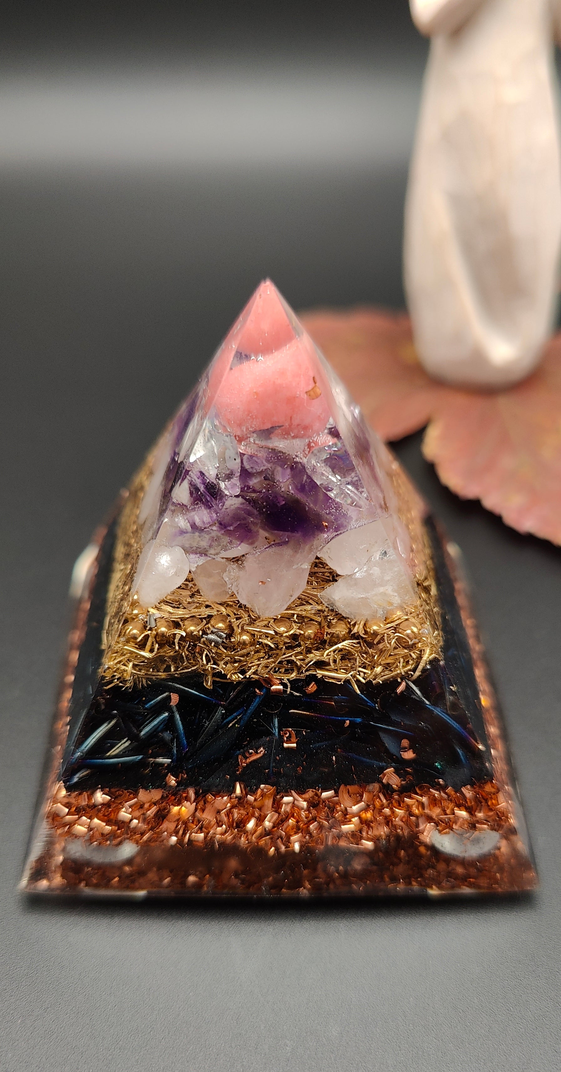 Verbaut ist in dieser handlichen Pyramide ein Thulit in der Spitze, dieser sitzt auf Bergkristall, Amethyst und Rosenquarz. Nachfolgend sind Messing Kugeln und Späne, angelaufender Stahl und Kupfer eingearbeitet. Agnihotraasche liegt zwischen den Metallschichten. Am Boden sitzt noch ein Torus-Symbol.