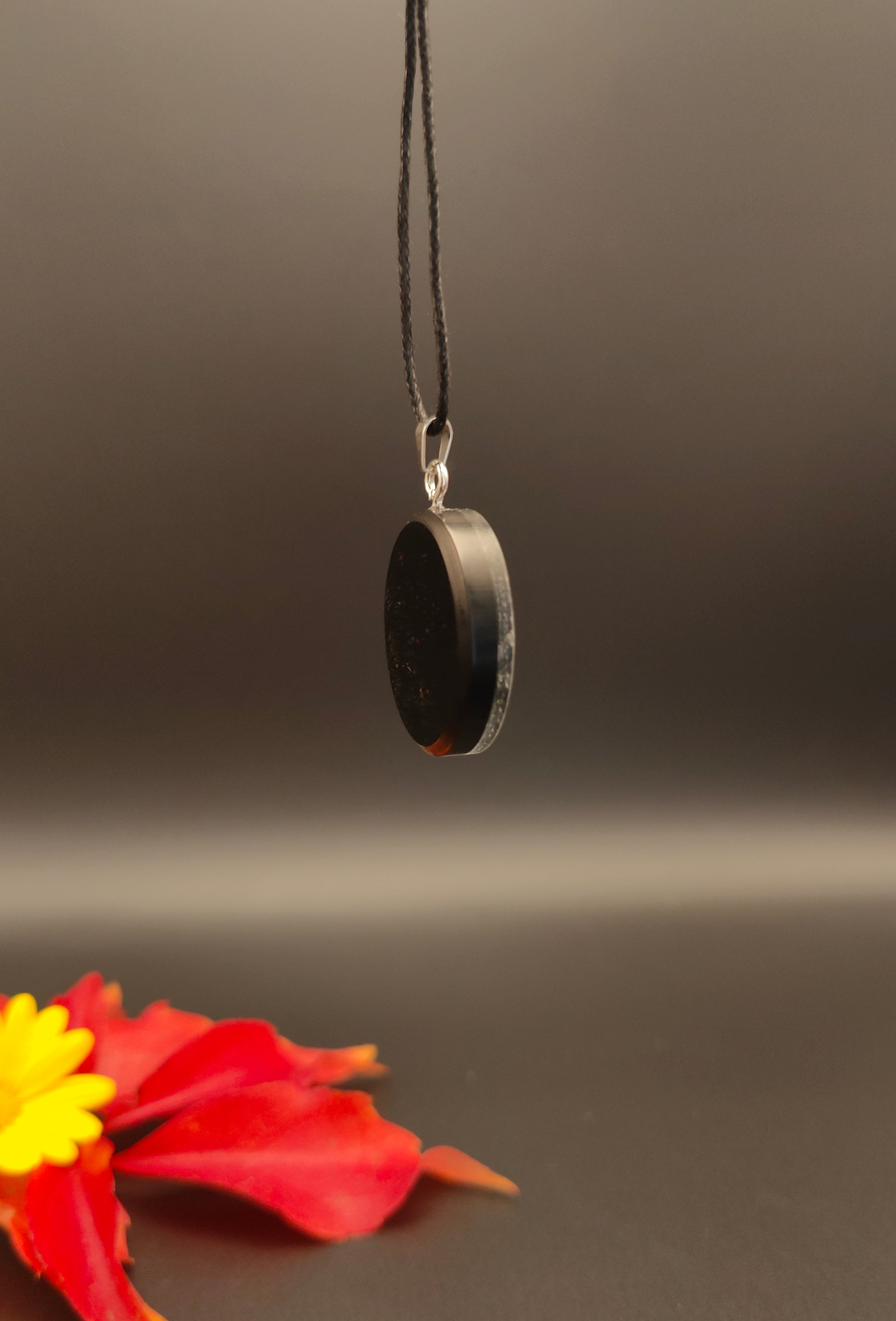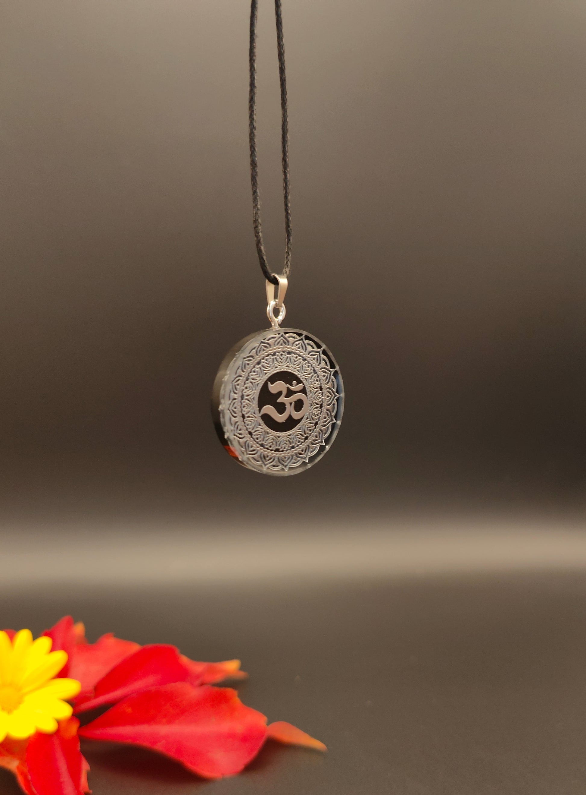 Wunderschöner schwarzer Anhänger mit einem silbernen Om-Symbol.