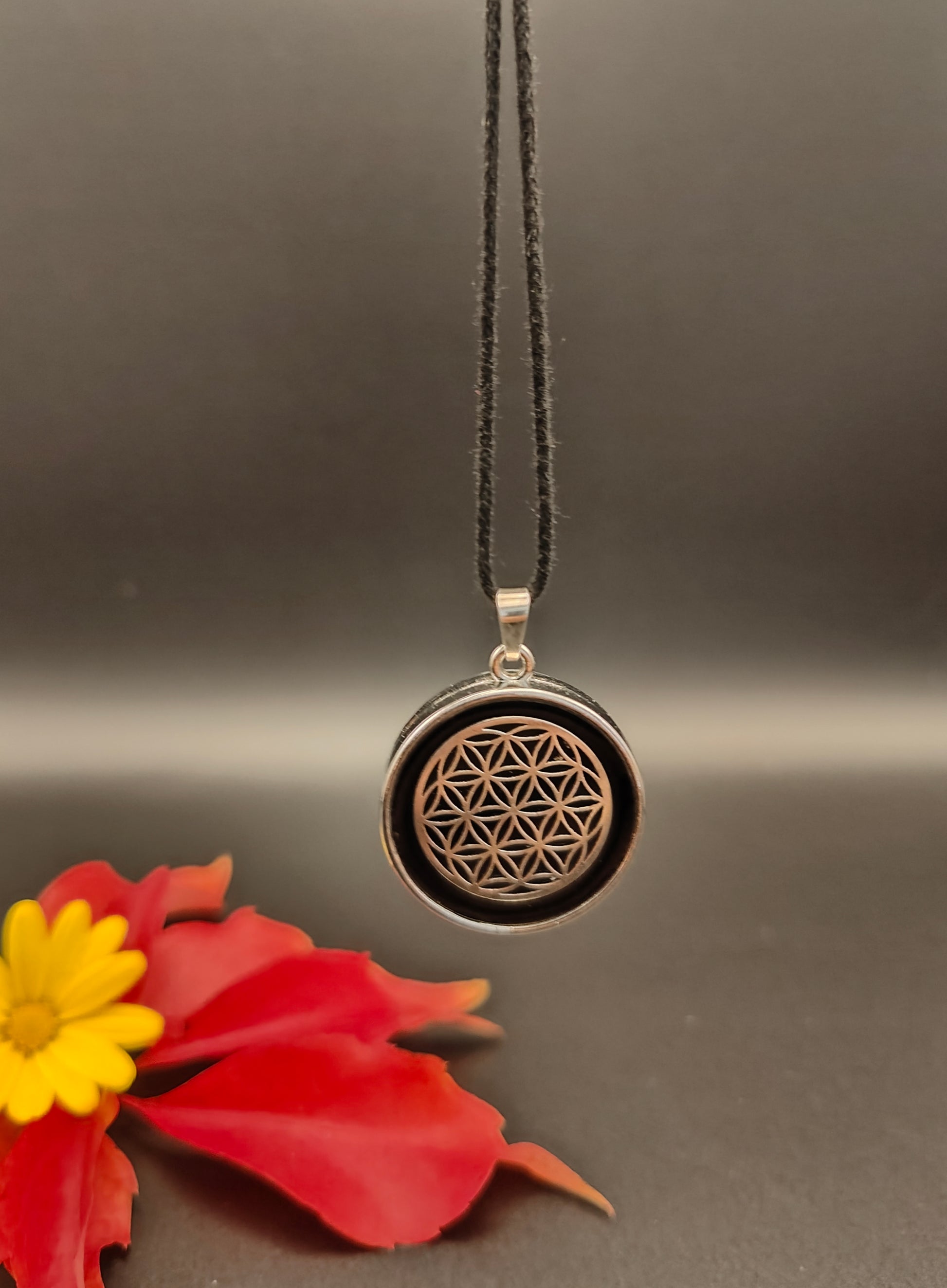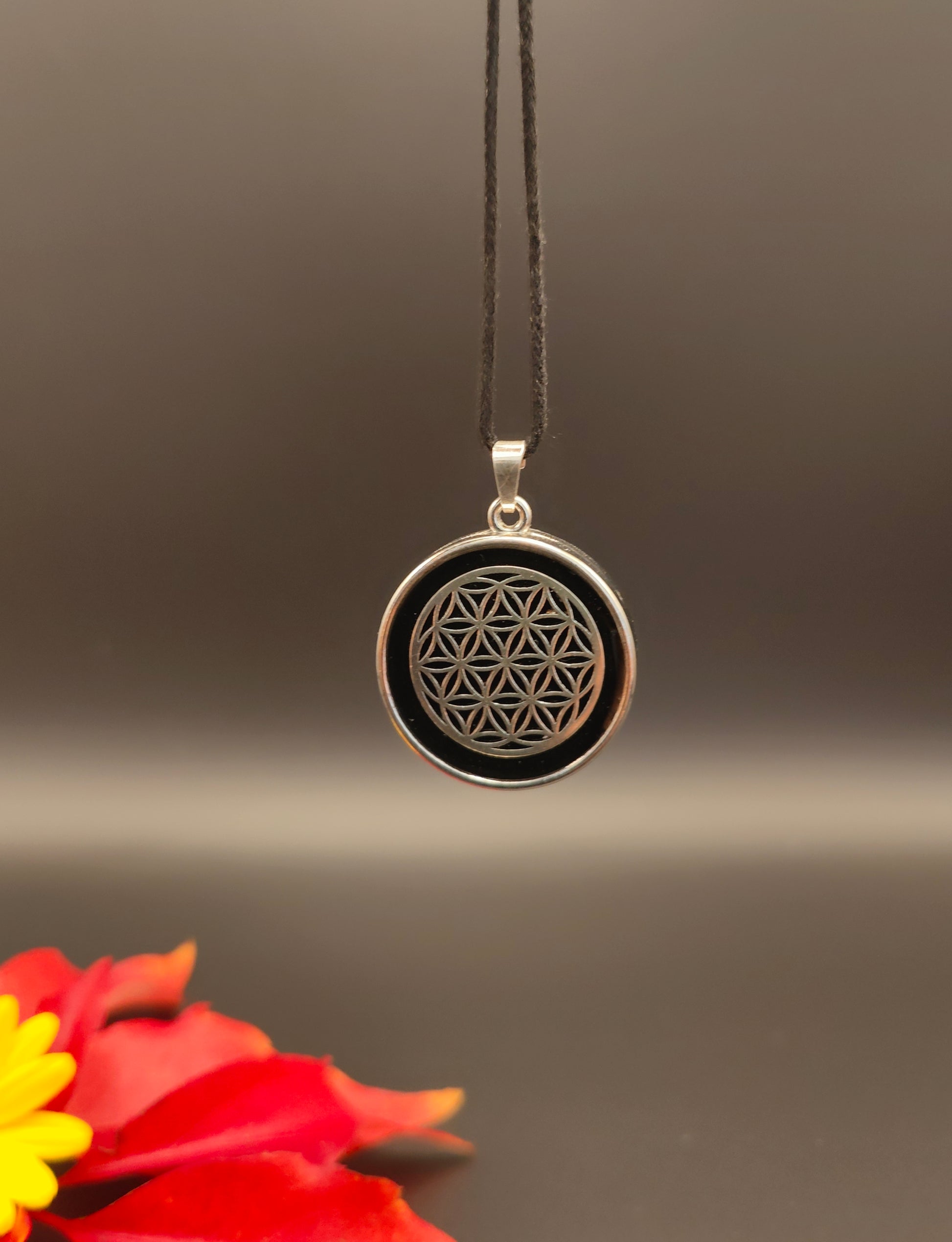 Wunderschöner schwarzer Anhänger mit einer silbernen Blume des Lebens aus Metall in einer Metallfassung. Enthalten ist in der schwarzen Farbe viel Shungit und Bergkristall in Pulverform, zudem Eisen, Messing und Kupfer. Der Durchmesser des Anhängers beträgt 3 cm, die Höhe ca. 0,7 cm.