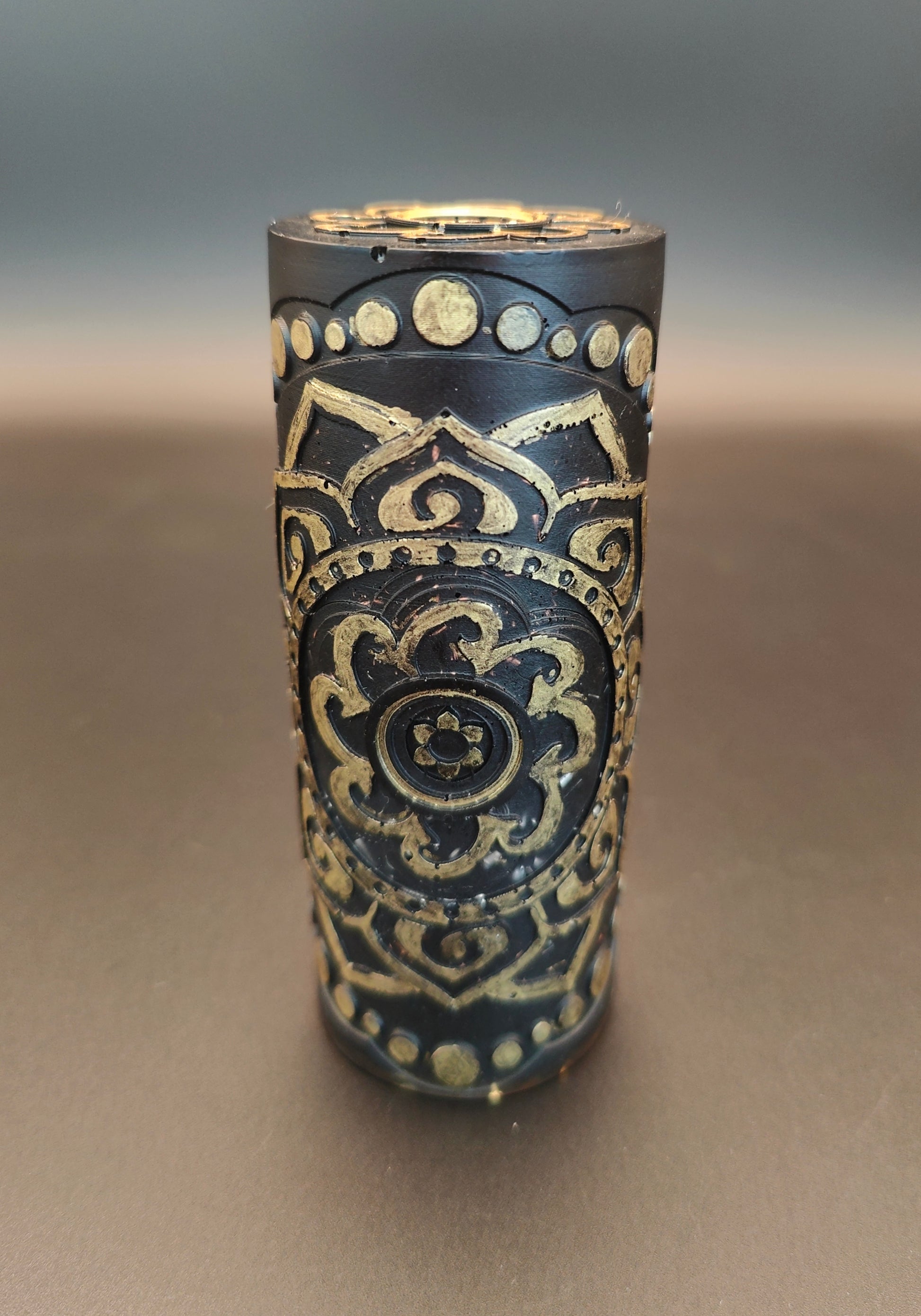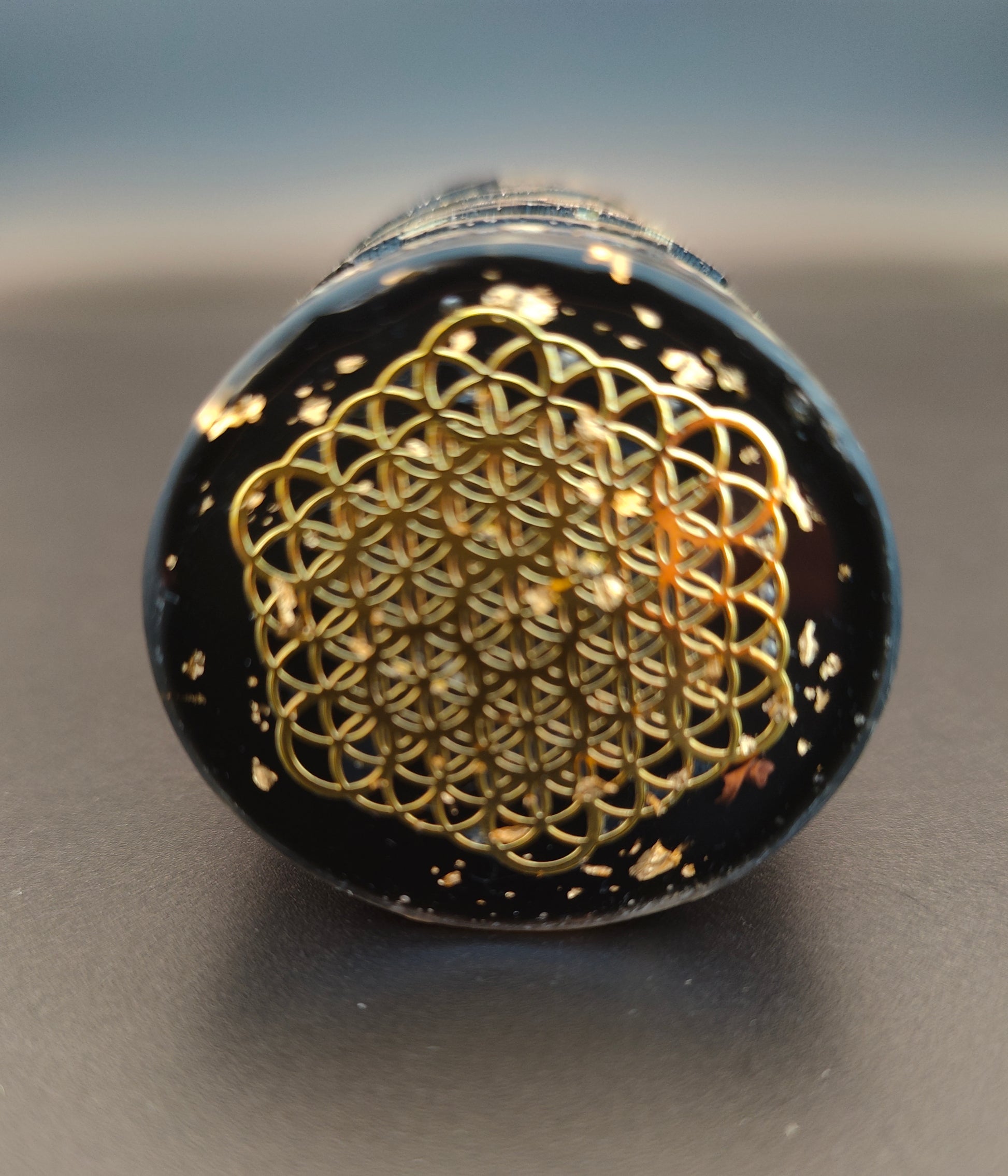 Gefüllt ist dieser Orgonit mit viel Shungit-Rohsteinen und -pulver, Baryt, Bergkristallpulver, schwarzem Turmalin und außerdem Agnihotraasche, Eisen, Messing und Kupfer