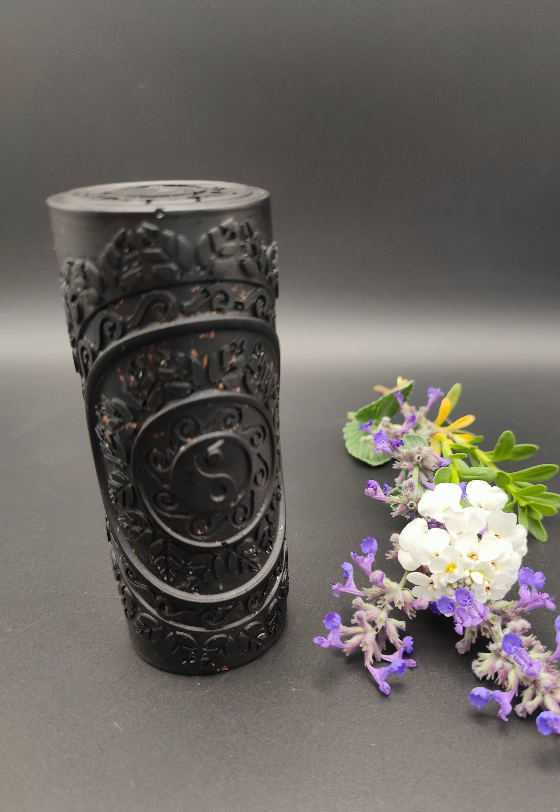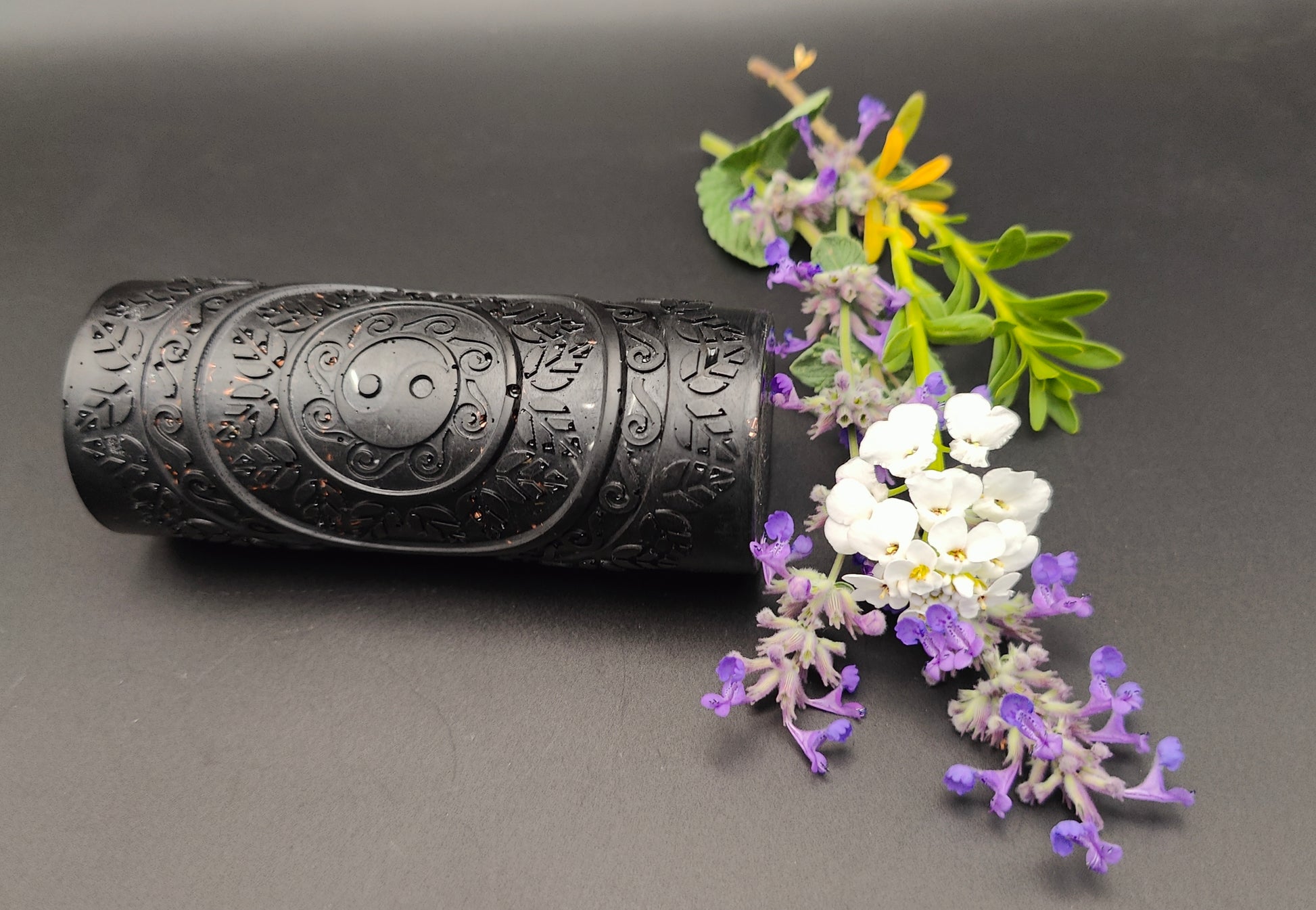 Gefüllt ist dieser Orgonit mit viel Shungit-Rohsteinen und -pulver, Baryt, Bergkristallpulver, schwarzem Turmalin und außerdem Agnihotraasche, Eisen, Messing und Kupfer
