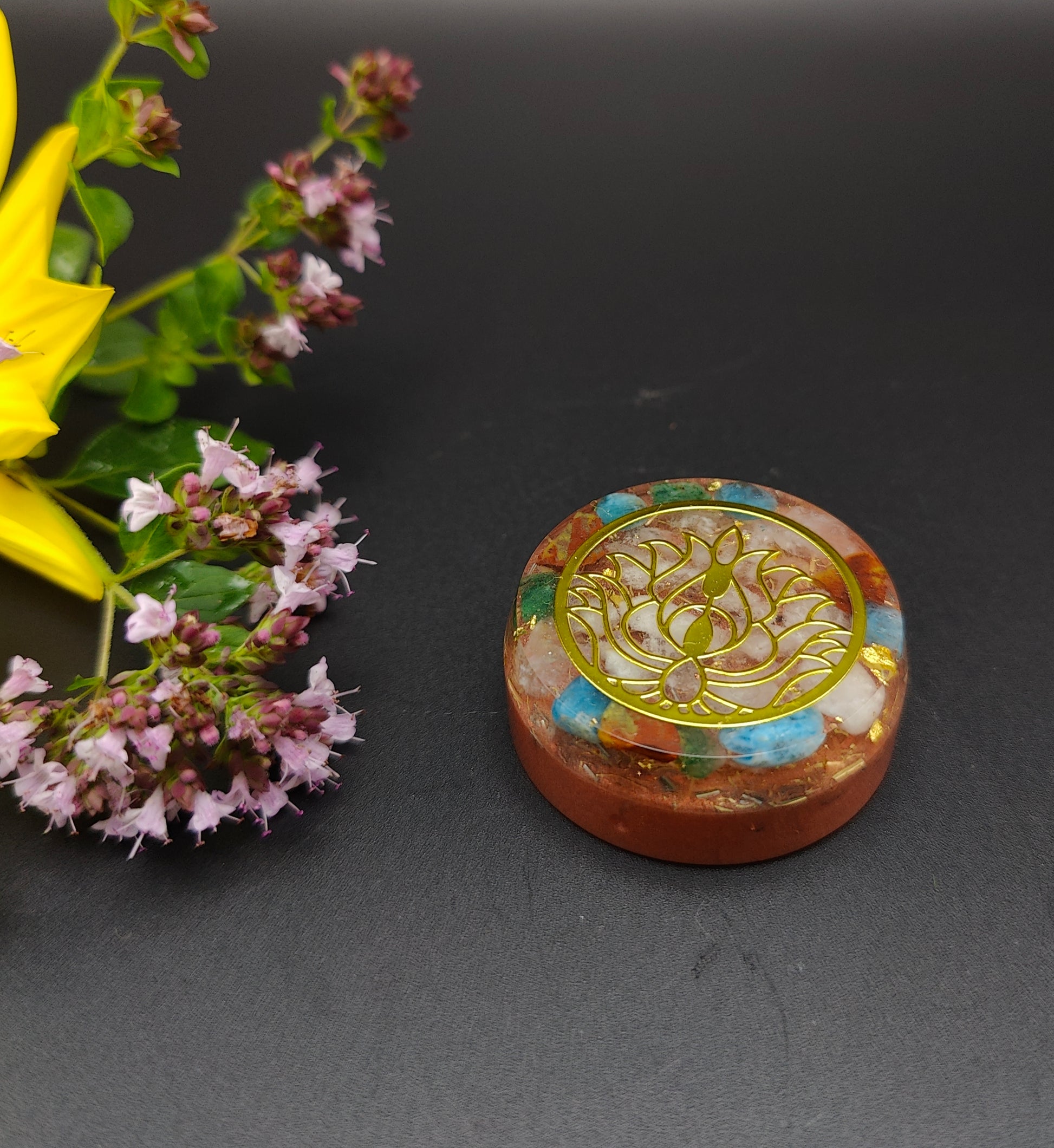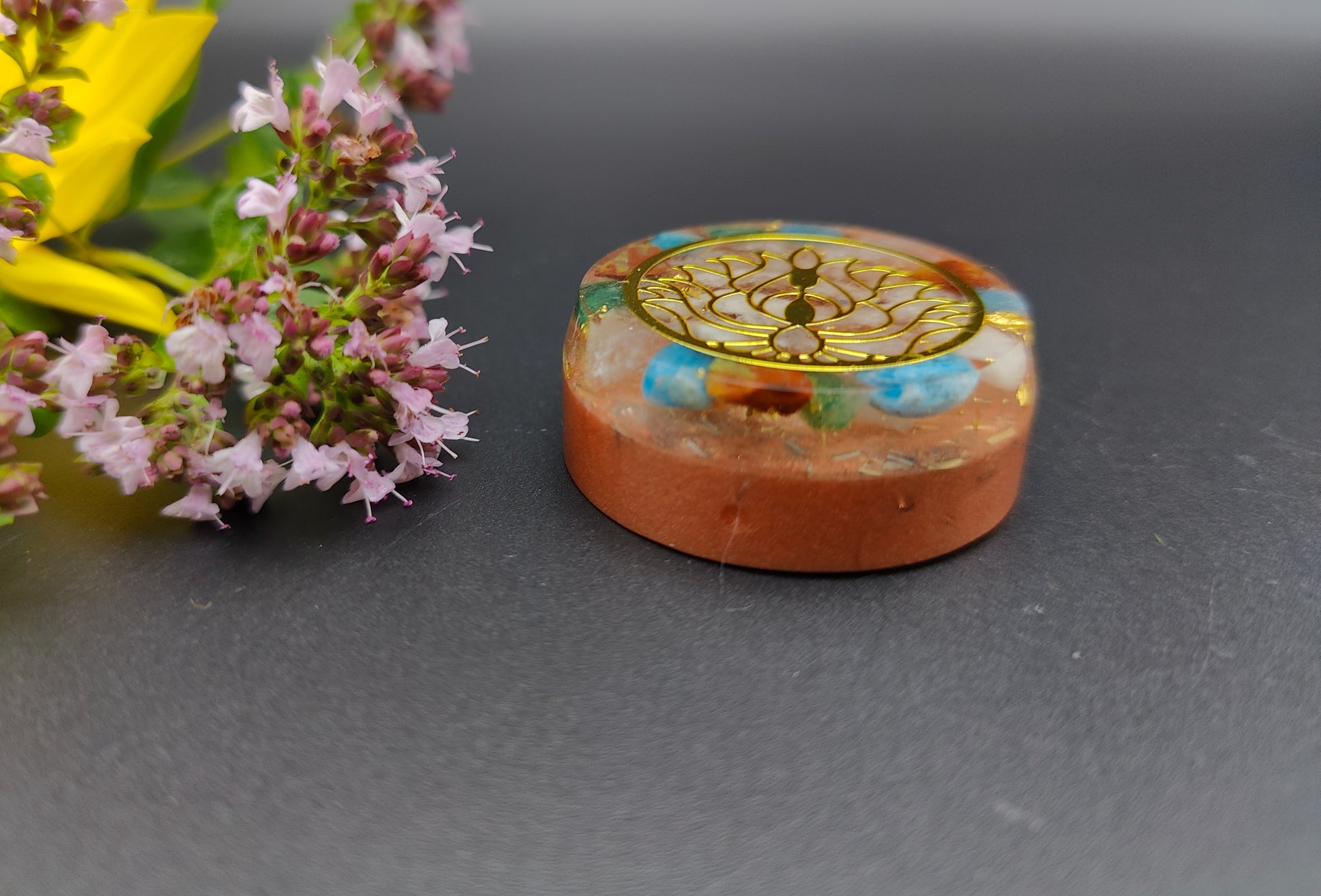 Dieser Orgonit ist mit einer goldenen Lotusblüte versehen. Darunter liegen Bergkristall, Apatit, Karneol, Schneequarz, Aventurin und 24K Blattgold. Die Farbschicht (ich kann mich nicht zwischen Altrosa und Lachs entscheiden ...) enthält Kupfer, Eisen, Messing und Agnihotraasche.