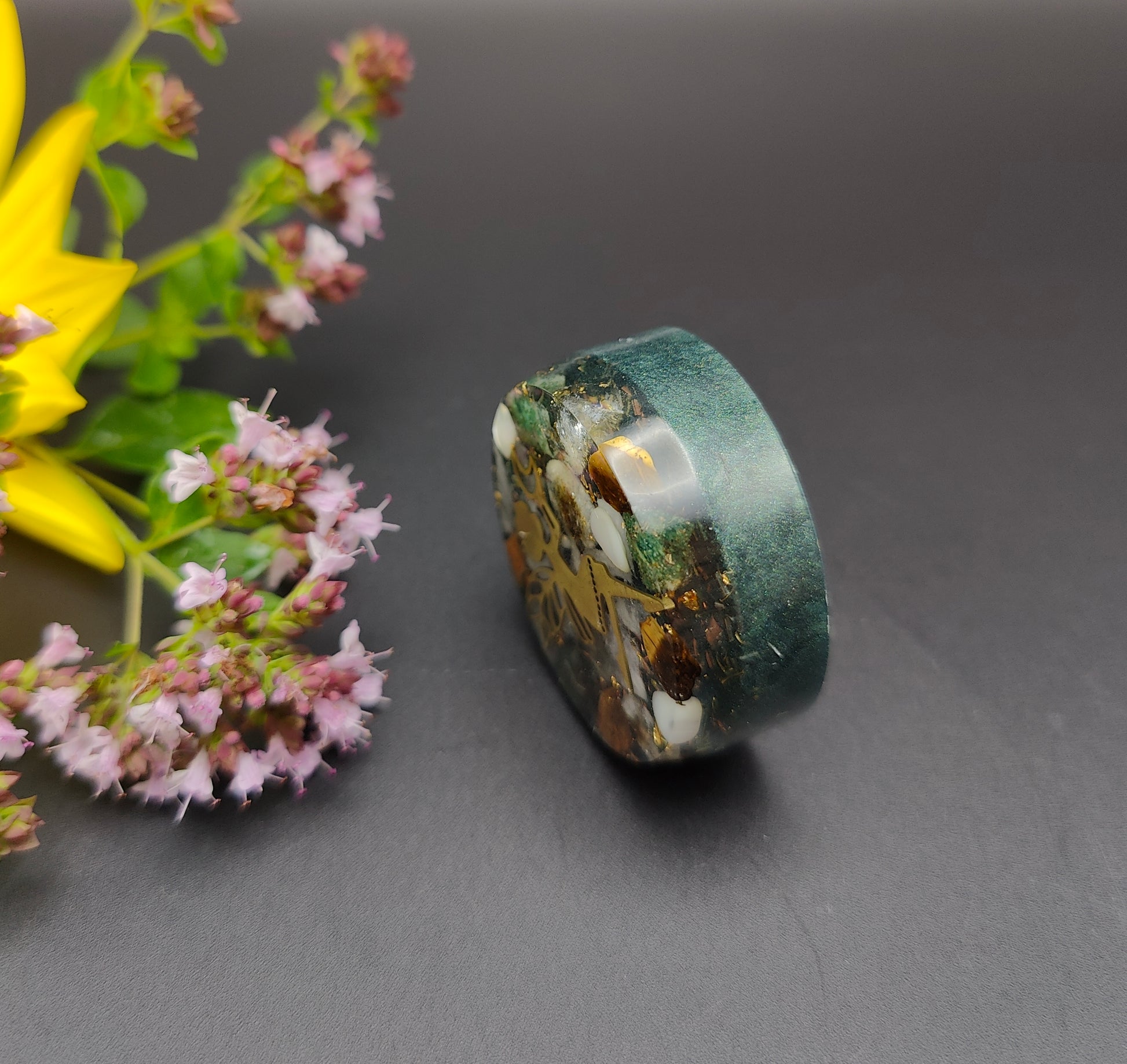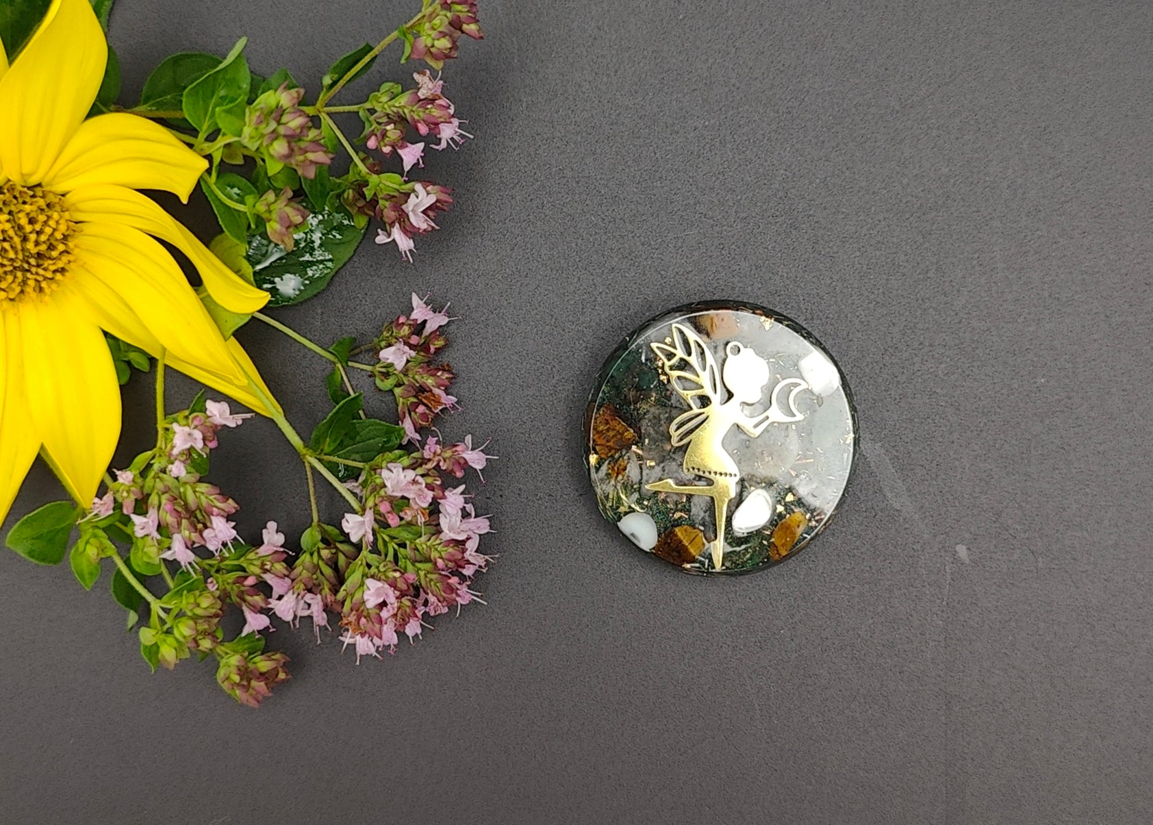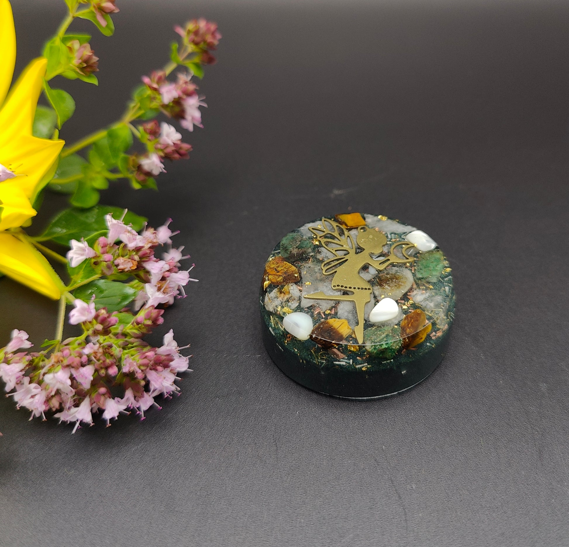 Dieser Orgonit ist mit einer zauberhaften Fee in Gold versehen. Darunter liegen Bergkristall, Tigerauge, Perlmutt, Citrin, Smaragd und 24K Blattgold. Die dunkelgrüne Farbschicht enthält Kupfer, Eisen, Messing und Agnihotraasche.