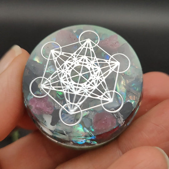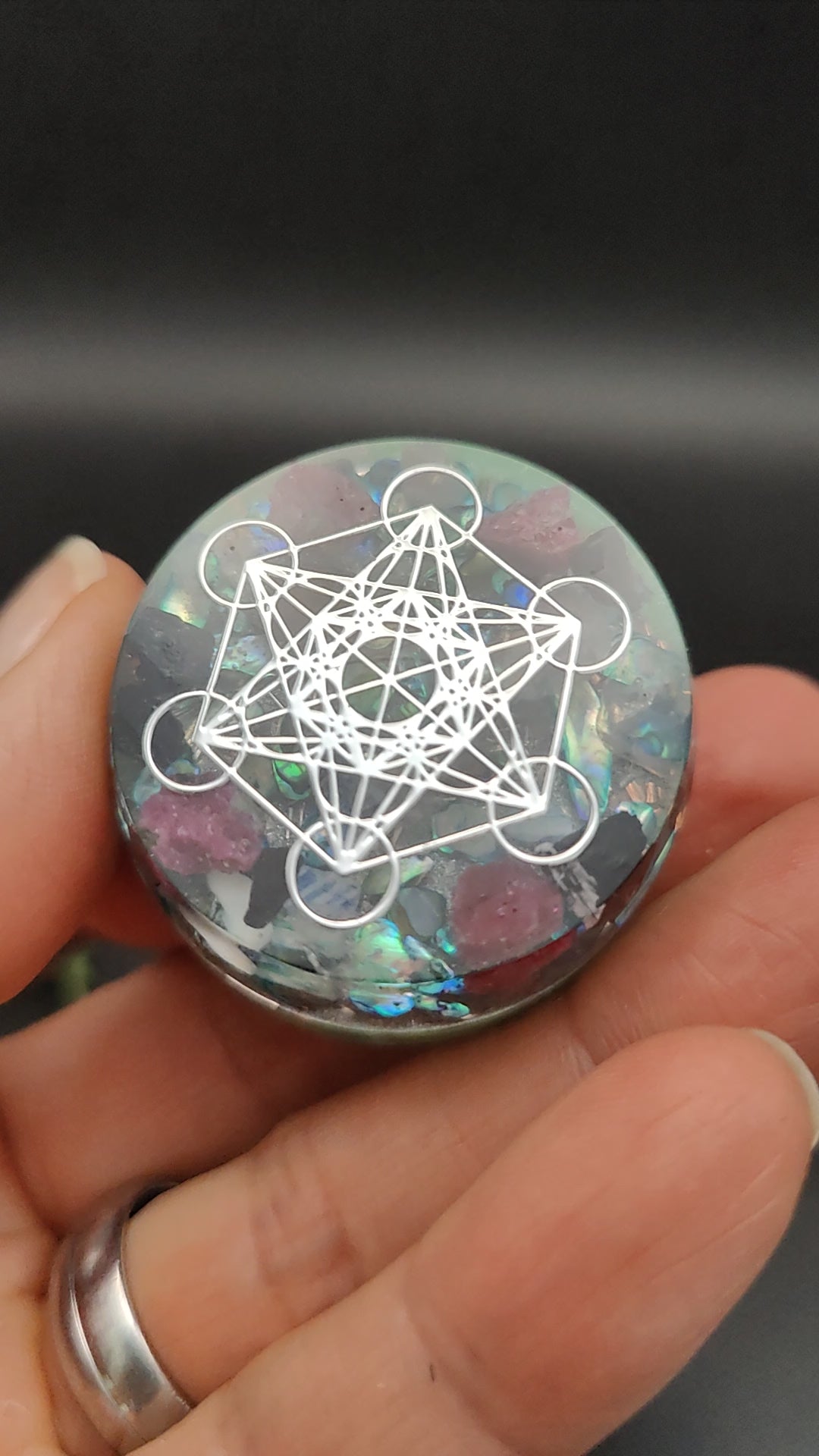 Dieser Orgonit ist mit einem silbernen Metatron versehen, darunter liegen Bergkristall, Rubin, Rosenquarz, Shungit, schwarzer Turmalin und darunter noch eine Schicht der wunderbar schimmernden Abalone/Paua-Muscheln.