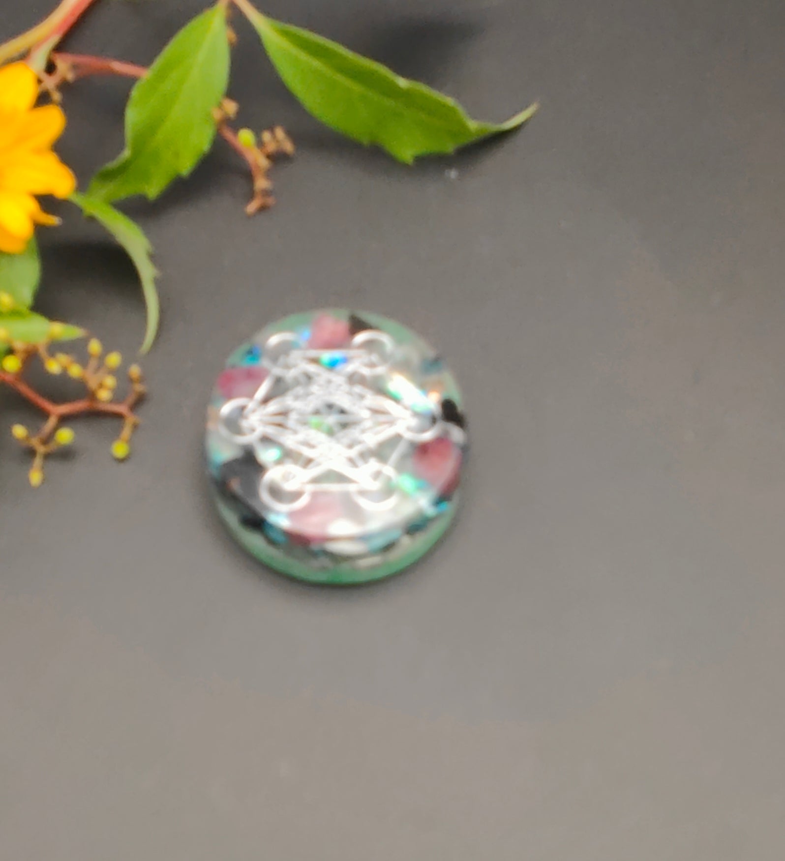 (Ich kann Taschenorgonite in beliebigen Farben, mit personalisierten Steinen, mit beliebigen Symbolen - oder auch ohne -, mit 4 oder 5 cm Durchmesser herstellen. Melde dich gerne beim Wunsch eines personalisierten Taschenorgonites.)