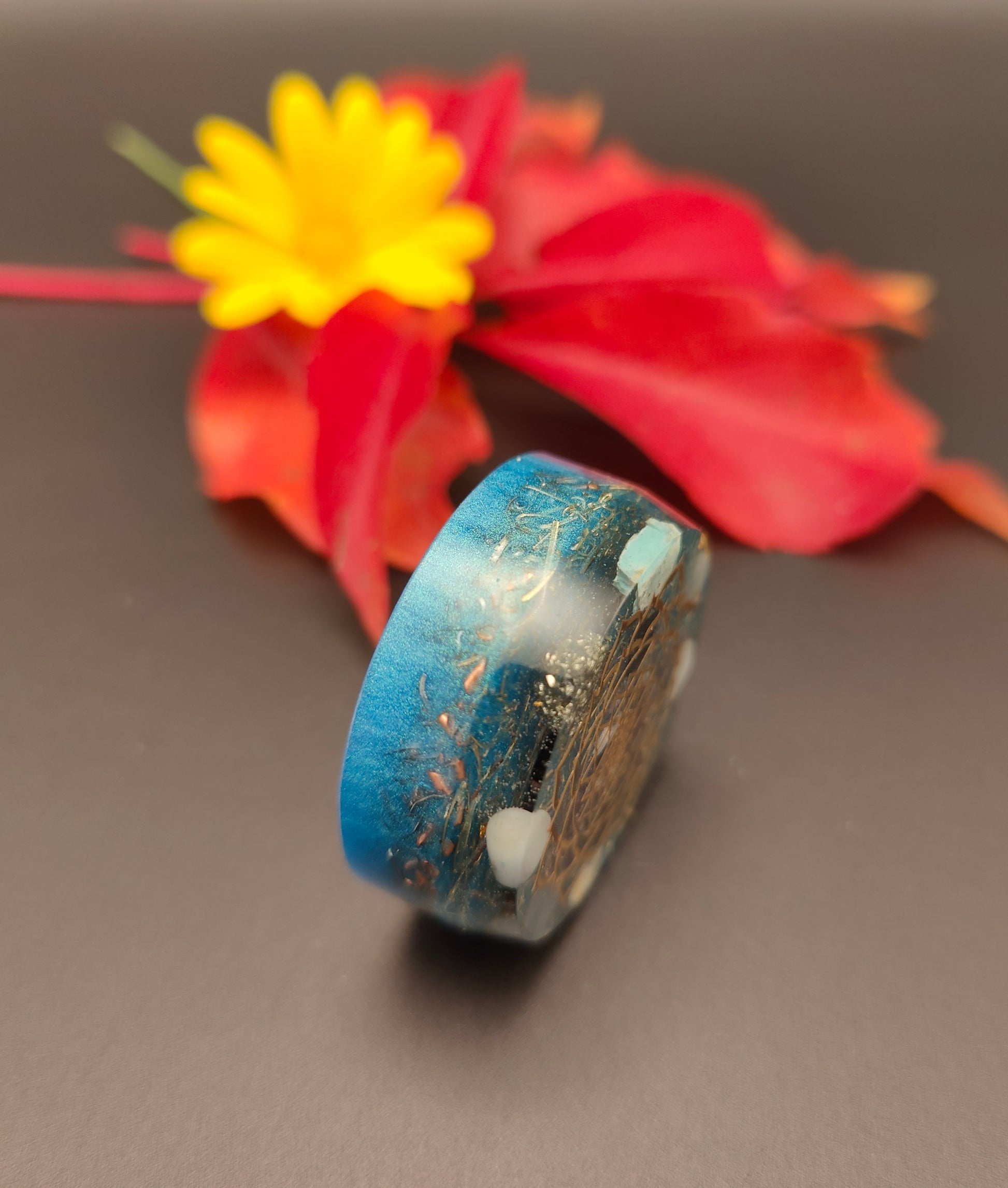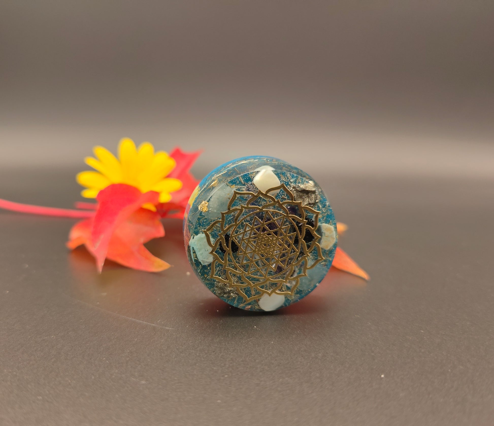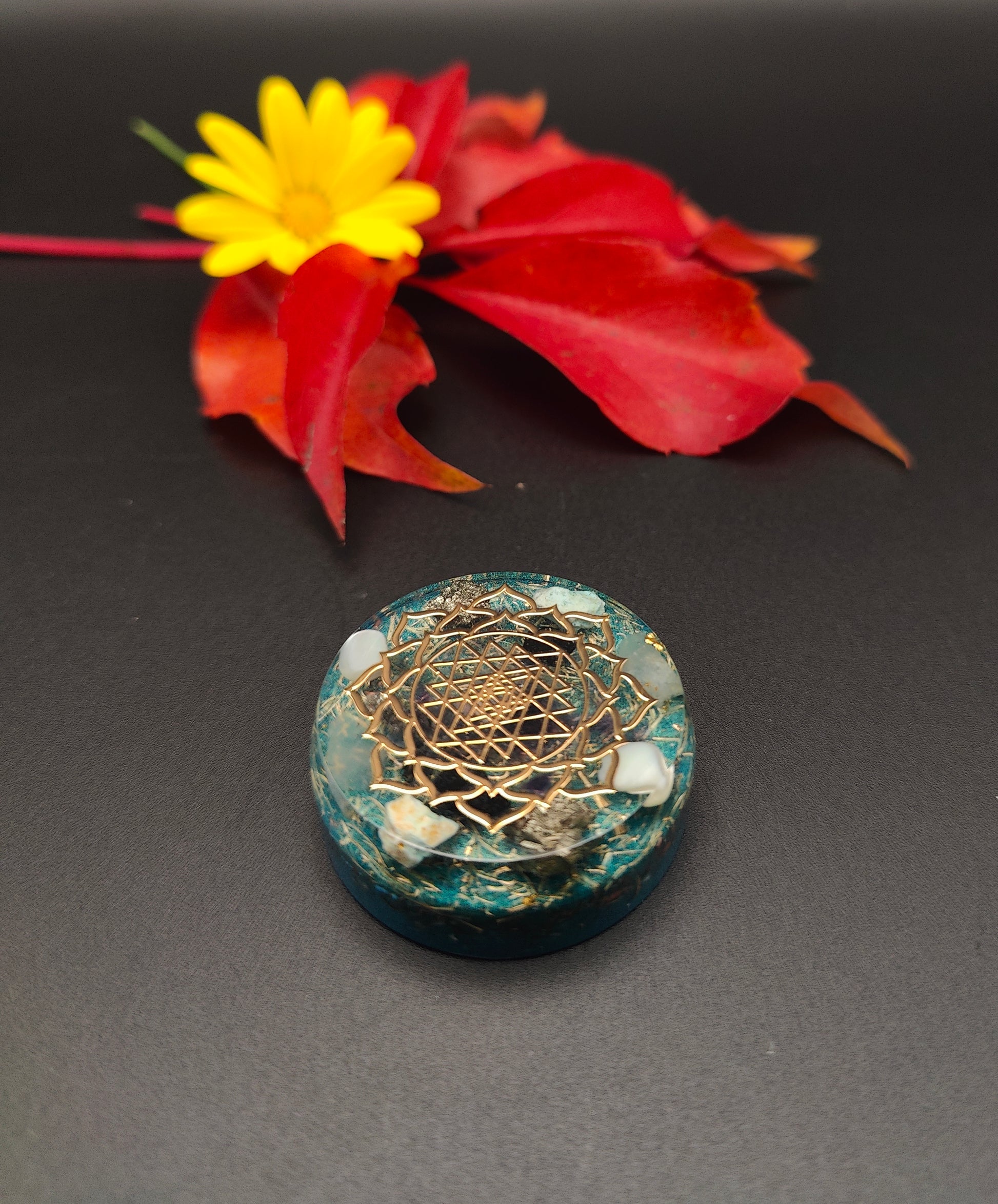 Dieser Orgonit in einem schönen Blauton ist mit einem groldenen Sri Yantra Symbol versehen, darunter liegen Pyrit, Perlmutt, Türkis, Aquamarin und Turmalin. Natürlich auch Bergkristall, Amethyst und Shungit. Die Farbschicht enthält Kupfer, Messing, Eisen und Agnihotraasche.