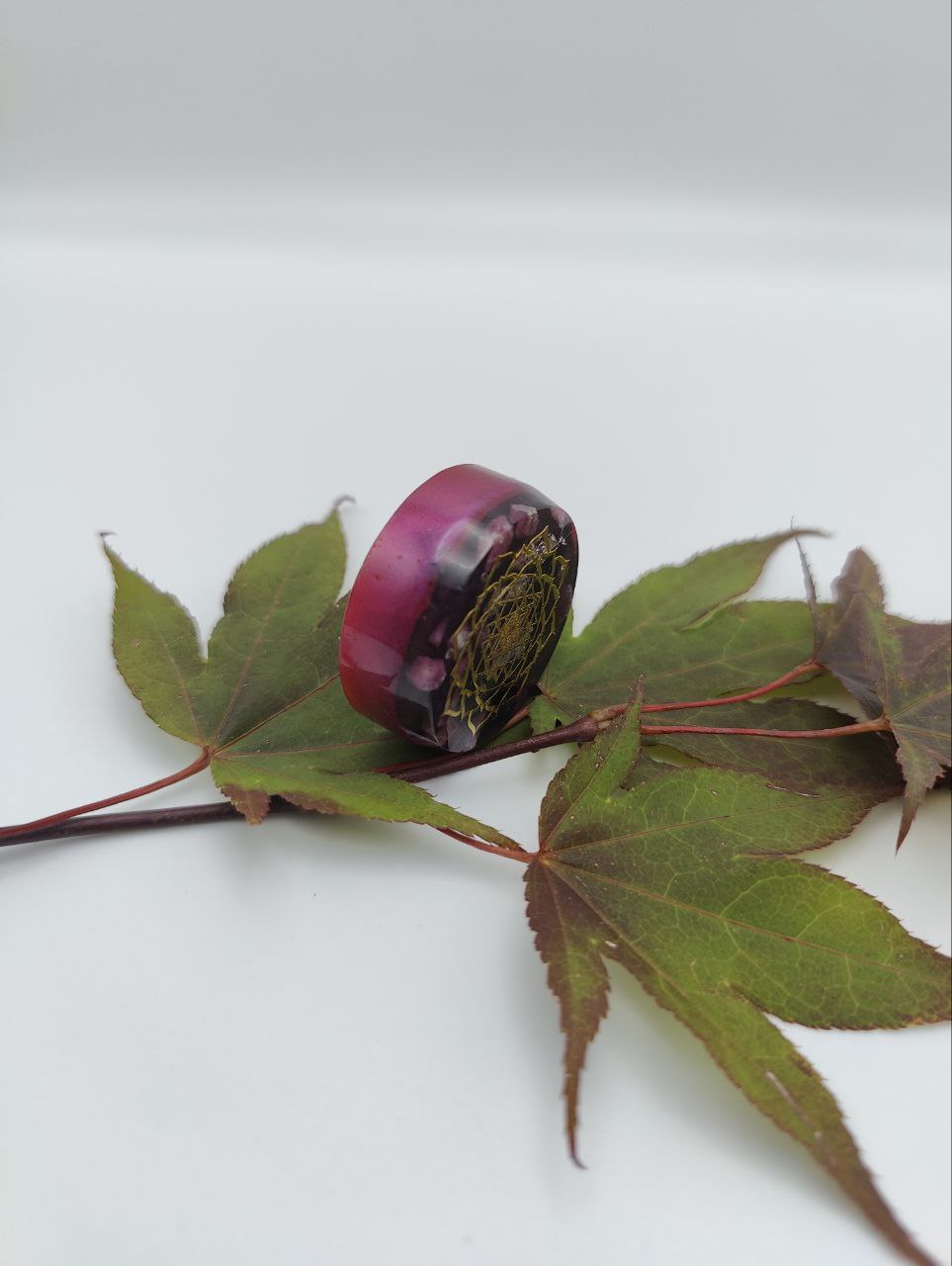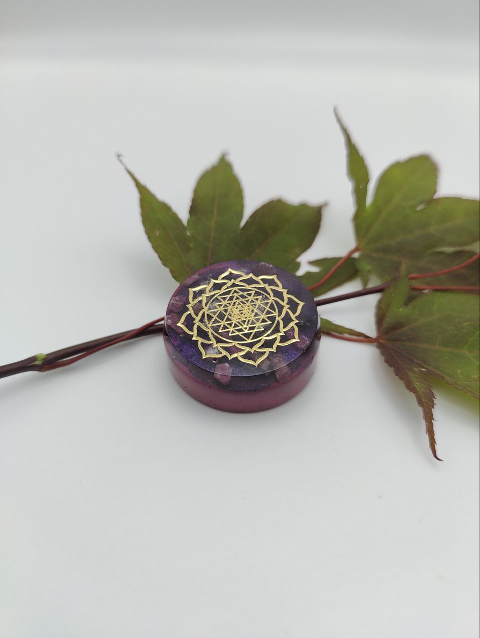 Dieser Orgonit ist mit einem goldenen Sri Yantra Symbol versehen, darunter liegen Rubin, Bergkristall, Amethyst und Shungit. Die Farbschicht enthält Kupfer, Eisen und Agnihotraasche.
