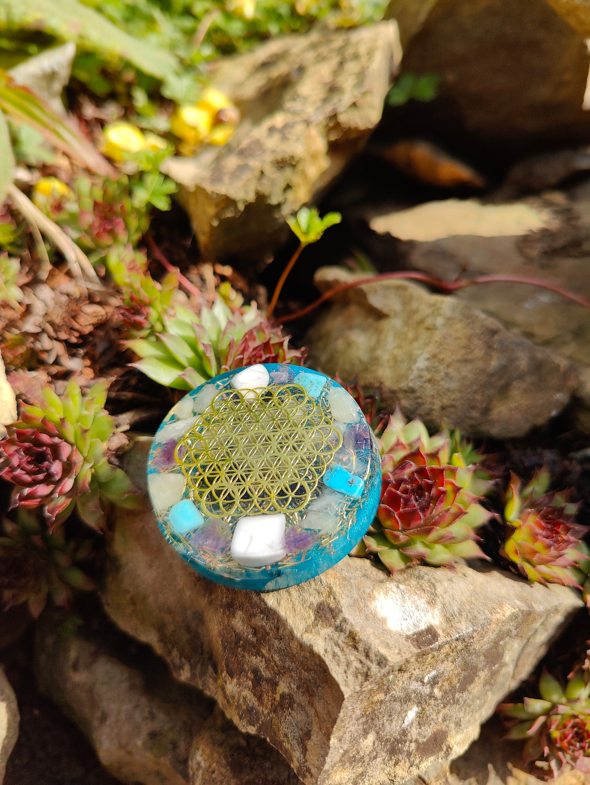 Dieser Orgonit ist mit einer goldenen Blume des Lebens versehen. Darunter liegen Bergkristall, Magnesit, Türkis, Aquamarin, Amethyst, Calcit und Shungit. Die Farbschicht enthält Kupfer, Messing, Eisen und Agnihotraasche.