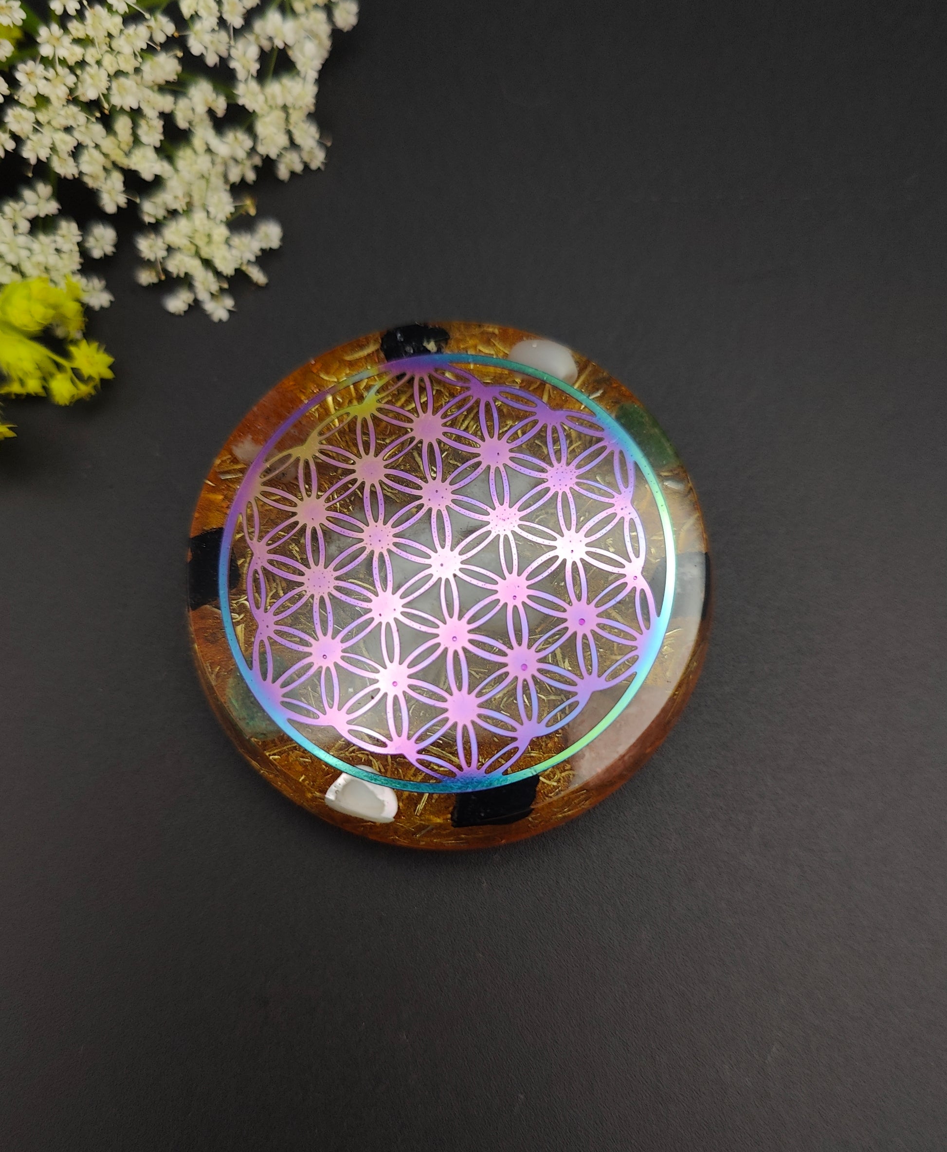 Dieser Orgonit ist mit einem besonderen „Regenbogen-Blume-des-Lebens“-Symbol versehen, das je nach Lichteinfall verschieden schimmert. Darunter liegen Bergkristall, Sonnenstein, grüner Aventurin, Turmalin und Perlmutt.