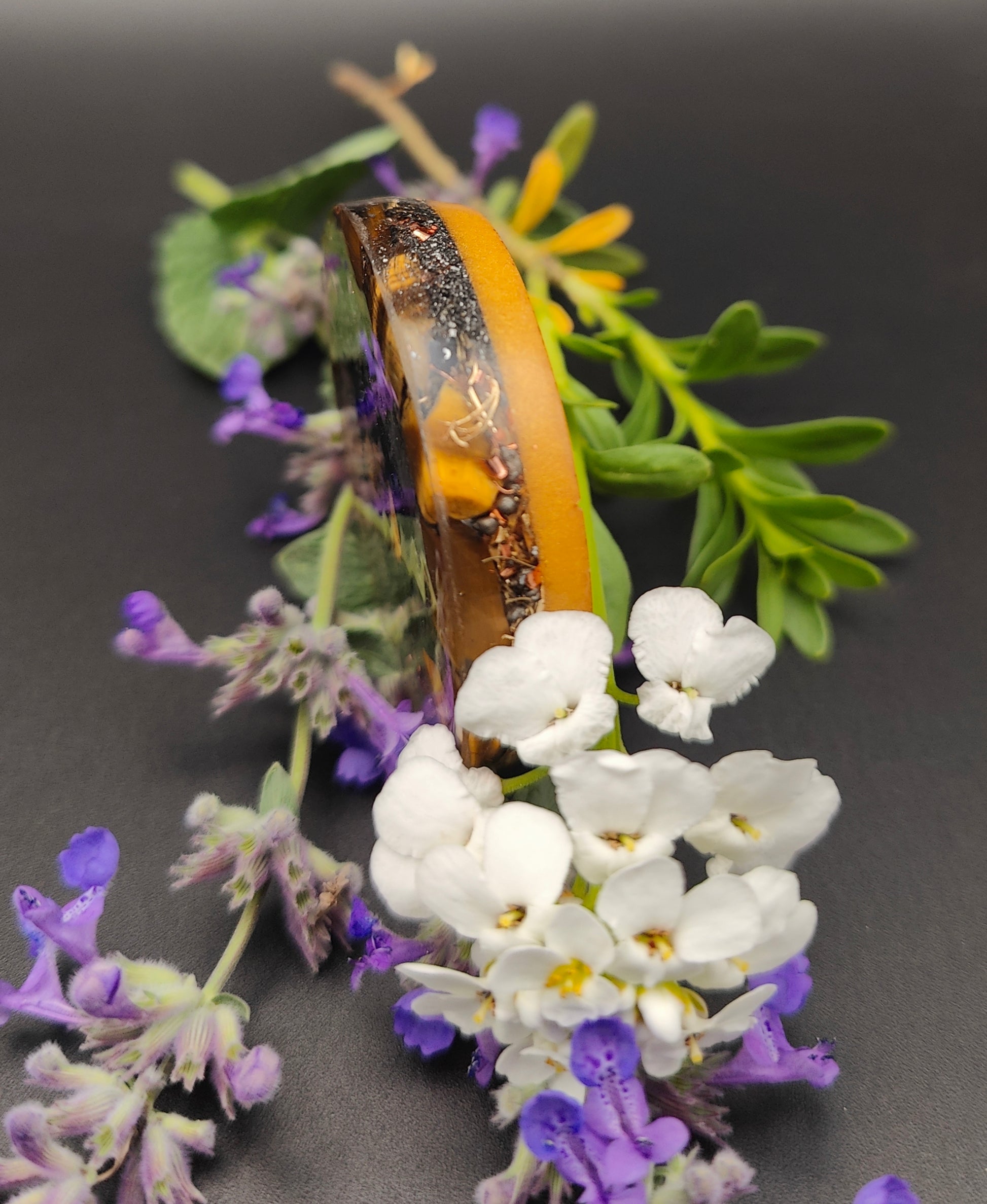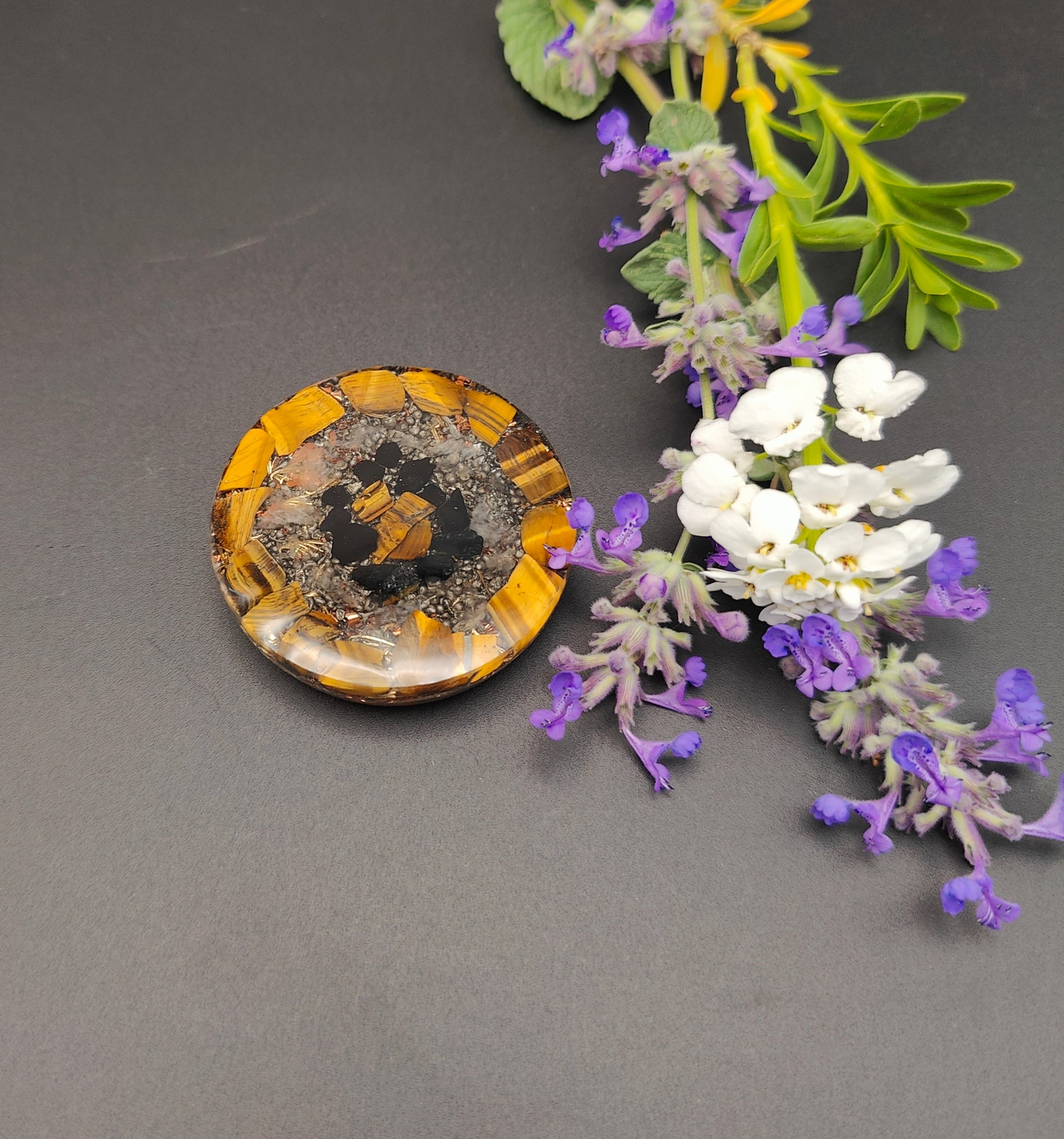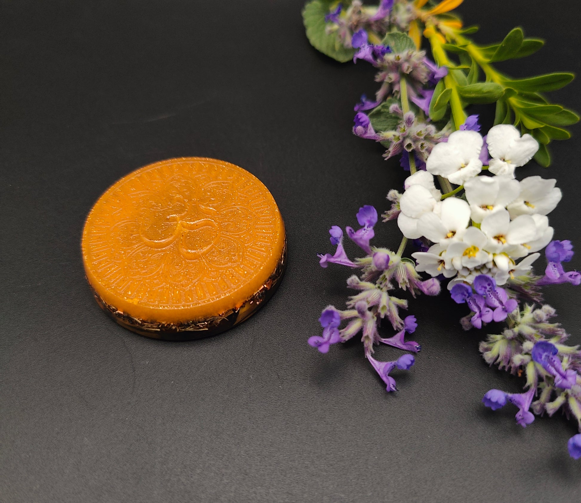 Dieser Orgonit ist mit einem gegossenen Om in Gold mit etwas Glitzer versehen. Darunter liegen Eisen, Messing und Kupfer, sowie Agnihotraasche. Zuletzt enthält die farblose Schicht Tigerauge, Bergkristall und schwarzen Turmalin.